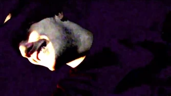 [Cut to Noah in the same building as the laundry (?). He sees a drinking fountain and runs over to it to drink. As he bends and points the camera behind him, a figure—presumably HABIT—quickly peeks around the corner behind him. Noah stops drinking water and coughs blood into the sink. Noah pans around to show that he has a nosebleed. He washes the blood off his fingers, still coughing and wheezing.